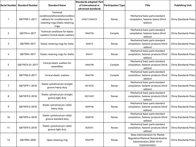 Společnost Dongbo slouží jako člen jednotky Národní technické komise pro standardizaci Upevňovací prvky po mnoho let a hostovaly 4. výroční zasedání 5. národního technického Výbor pro standardizaci spojovacích prostředků v roce 2015. nebo se zúčastnil formulace a revize 13 národních standardů včetně technických Podmínky pro elastické opěrné prsteny, Elastické válcové kolíky a podložky na disku.